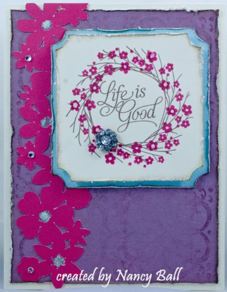 The border and other shapes were cut with Art Philosophy, CTMH's exclusive Cricut cartridge. The background was stamped in second generation Cocoa with an image from Damask Tiles. Then three types of bling were added: Glitz to the flowers and border along with Bitty Sparkles. I also added one of our new, gorgeous Rhinestone brads.